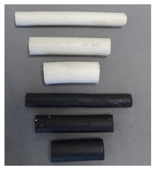 Another step is extruding rods with a circular cross-section (Ø10.4 mm; Ø13.2 mm; Ø16 mm) from the previously prepared billet. Then, the rod is divided into sections of certain length (84 mm; 60 mm and 40 mm). Figure 8 shows the model samples.