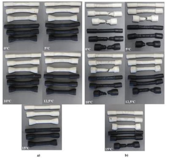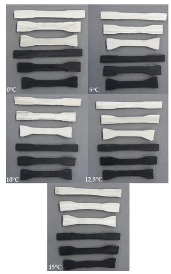 Upon analysing the test results, it was observed that the samples with the smallest diameter were rolled without slippages between the tools and the billet, regardless of the temperature of the material. The samples with the diameter Ø13.2 mm had no ruptures in the majority of cases (the exceptions are white and black samples rolled at 0 °C). The elements made of white plasticine with the biggest diameters were ruptured in the case of cross-wedge rolling of the material cooled to 0 °C, 5 °C and 10 °C, whereas the black samples were ruptured in the entire range of temperatures. The cracks are a result of the significant slippage, which resulted in an immediate rupture of the sample in the beginning of the rolling process. In the samples with medium and the biggest diameter, screw-shaped neckings were observed. The neckings initiated the rupture.