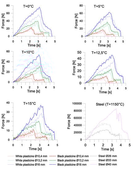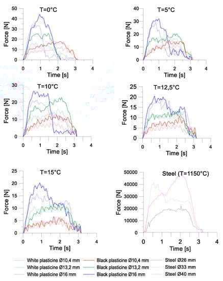 Samples made of black plasticine cannot be used to model such limiting phenomena as inner cracks due to the lack thereof in the conducted tests as well as the instant rupture at every temperature. As far as white plasticine is concerned, it can model the limiting phenomena occurring during the hot-forming process of 50HS grade steel only in the case of temperatures of 12.5 and 15 °C. The values of the estimated force obtained for 12.5 °C were more similar to the ones from the real process.