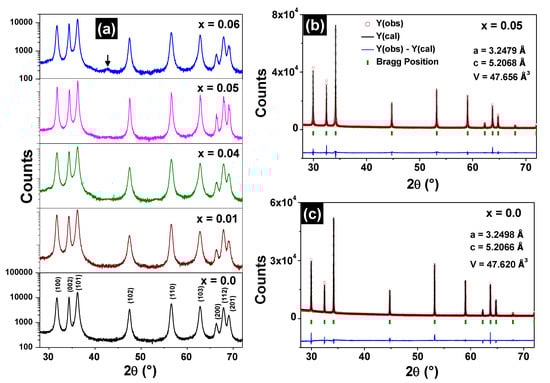 The XRD patterns of the Zn1−xFexO samples are shown in Figure 1a. The Bragg peaks coincide with those found for the wurtzite-like structure when x ≤ 0.05, indicating that these samples are monophasic. For x = 0.06, a secondary phase, corresponding to the ZnFe2O4 spinel, was detected in the XRD pattern. The refined parameters are listed in Table 1. It is noted that lattice parameters (a, c) and cell volumes (V) do not present any significant variation increasing the iron content.