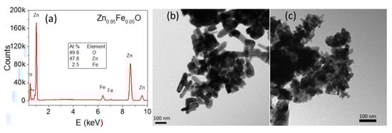 EDX spectrum of the Zn0.95Fe0.05O sample (a); TEM images for the ZnO (b) and Zn0.95Fe0.05O (c) samples.