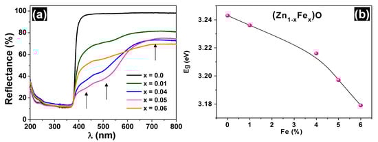 The UV-VIS diffuse reflectance spectra of the samples are shown in Figure 3a. The reflectance profile for wavelength λ > 400 nm is significantly modified with the iron doping of ZnO. In this λ range, the line basis decreases sharply and there are visible steps of approximately 442, 516, and 728 nm (i.e., energies usually attributed to Fe3+ [16,17]). In addition, progressive smoothing at λ ≈ 380 nm is observed in the angular profile, increasing the iron concentration.