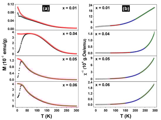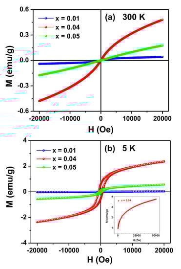 The curves measured at RT (Figure 6a) are typical for PM systems, although a faint hysteretic contribution can be identified by closely inspecting the curve of the sample x = 0.01. In a different way, the M (H) curves obtained at 5 K for the x ≥ 0.04 samples showed clear magnetic irreversibility, whereas for the x = 0.01 sample only a modest hysteresis could be observed by a zoom (not shown) in the region of low applied fields.