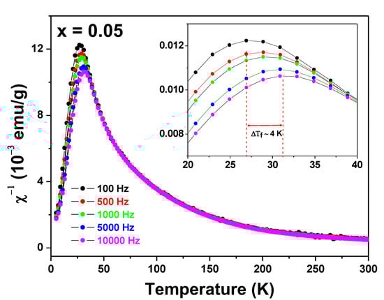 DC magnetization versus temperature curves, M (T), were measured in the temperature range of 2–300 K, with a probe field of 100 Oe for all samples. Particularly for the sample x = 0.05, the curves were obtained in applied fields other than 100 Oe (see Supplementary Materials). For such measurements, the ordinary zero field cooling (ZFC) and field cooling (FC) protocols were adopted. AC magnetic susceptibility (χ′) versus temperature curves were performed in the temperature range of 10–300 K, in a 10 Oe oscillating probe field, with frequencies (f) ranging from 100 to 10 kHz. In addition, the magnetization loops versus applied magnetic field were measured at 300 and 5 K. All these measurements were made using the vibrating sample magnetometer option in a physical property measurement system (PPMS–Quantum Design - EverCool II).