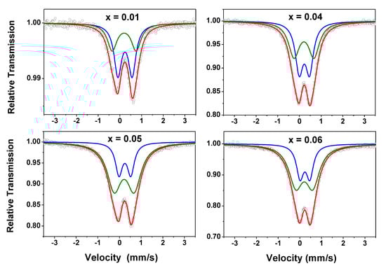 On the other hand, the analysis of the spectral evolution of all samples under decreasing temperature showed that as a general trend, the higher the x, the higher the temperature to begin the magnetic split of the spectrum. Thus, it can be inferred that this initial magnetic fraction of the spectra can be attributed to clusters of two or more neighboring iron atoms, which previously contributed to Doublet II. Although the Doublet II is supposed to be the first to convert and reveal a magnetic character (assumption that can be explained considering this component as coming from iron clusters), eventually the magnetic fraction of any spectrum increases at the expense of the PM fraction, formerly contributing to the Doublet I. This means that the isolated Fe magnetic moments also experience a slowdown relaxation and spin freezing effects as the sample temperature decreases.