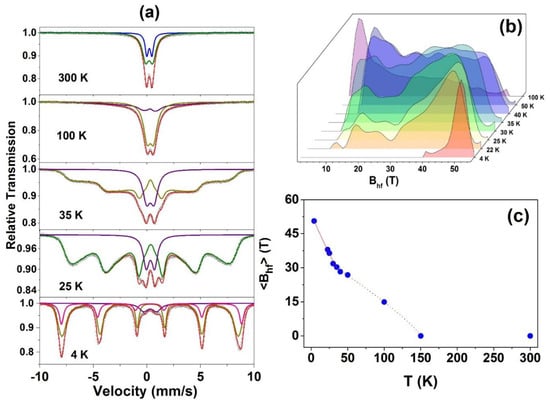 The temperature evolution of Bhf shown in Figure 8c for x = 0.05 sample reinforces the PM → SG interpretation since it reproduces qualitatively the analogous Bhf behavior found in the literature for well-known SG systems [25,26].
