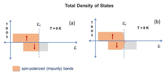 The change in the magnetic behavior of the samples studied under temperature variation can be interpreted based on the simultaneous occurrence of two types of magnetic exchange interactions between the Fe impurities diluted in the wurtzite-like structure. Both may depend on the concentration of iron or temperature and are mutually competitive. One is the superexchange interaction, which involves two neighboring iron moments (i.e., Fe3+ cations as shown by Mössbauer spectroscopy), mediated by an oxygen anion. It is more significant when the concentration of iron moments in the ZnO matrix is higher since the pairs of adjacent magnetic moments are more numerous for higher x. Depending on the configuration of two neighboring ferric cations, the coupling is parallel or antiparallel, as established by several first principle calculations [27,28]. However, in general, these theoretical studies do not consider the presence of cationic vacancies close to the localized moments. Certainly, taking into account this complex vacancy-dopant defect would give simulations much more sophisticated, but more realistic magnetic energy values would be achieved. Here, we assume that the antiparallel coupling is the most stable, as indicated by some numerical studies. At least for x = 0.04 and 0.05, the interaction would percolate the crystal, leading to a long-range AFM order in the absence of thermal agitation or any other competitive interaction. Indeed, the magnetic frustration (i.e., the spin-glass state) observed for samples at low temperatures indicates that there is a magnetic competition. Plausibly, it comes from the indirect exchange interaction between iron moments, mediated by charge (and spin) carriers (i.e., electrons and/or holes) in the impurity bands created by the iron doping of the ZnO matrix. Impurity bands are created because Fe3+ cations are not isovalent to Zn2+ and may introduce cationic vacancies in the matrix, as discussed in the Mössbauer section. The iron cations may trap electrons in hydrogenic orbits, while vacancies have holes available to trap. Each iron cation/zinc vacancy exerts a proper central force under which the carrier charge (i.e., the electron/the hole) is bound. When electrons/hole orbitals overlap spatially, extended donor/acceptor levels are formed, and the density of states depends on the concentration of iron. Presumably, these are shallow orbitals, i.e., the acceptor levels are just above the top of the valence band, whereas donor levels are right below the bottom of the conduction band. The number of donor and acceptor levels is the same since a vacancy is created for each pair of dopants. Therefore, magnetic cations and vacancies that share the same region in the ZnO matrix form two impurity bands inside the gap. However, the band structure of the semiconductor Zn1-xFexO may be more complex due to the partial degeneration of the Fe3+ d states (i.e., t2g and eg orbitals) due to the crystalline field. Thus, in the absence of a theoretical calculation and considering all the factors that could determine the Zn1-xFexO energy band structure, we propose a simple description of the total density of states (TDOS), shown in Figure 9.