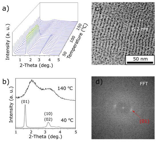 Small-angle X-ray diffraction (SAXRD) and TEM analysis of 2-LA material. (a) Temperature evolution of 1D SAXRD profile during heating. (b) Comparison of 1D XRD diffractograms collected at 40 and 140 °C. (c) TEM image of a heat annealed material. (d) 2D Fast Fourier Transformation (FFT) of image shown in (c) with maximum assigned to (01) (red arrow).
