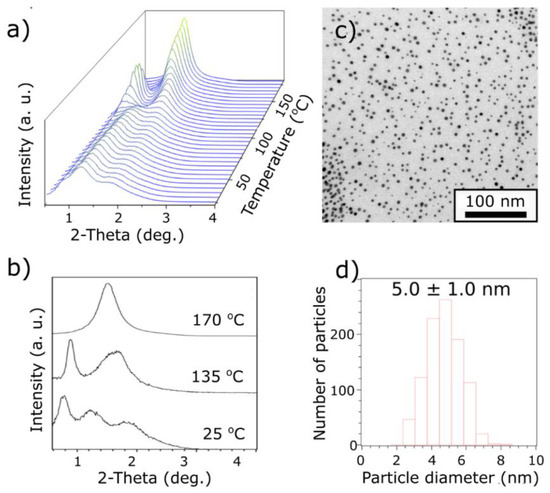 SAXRD and TEM analysis of 5-LMLA material. (a) Temperature evolution of SAXRD peaks during heating; (b) comparison of XRD peak location at temperatures of 25°C, 135°C, and 170°C as obtained by integration of suitable patterns; (c) TEM image of material; (d) histogram of size distribution of 5-LMLA nanoparticles