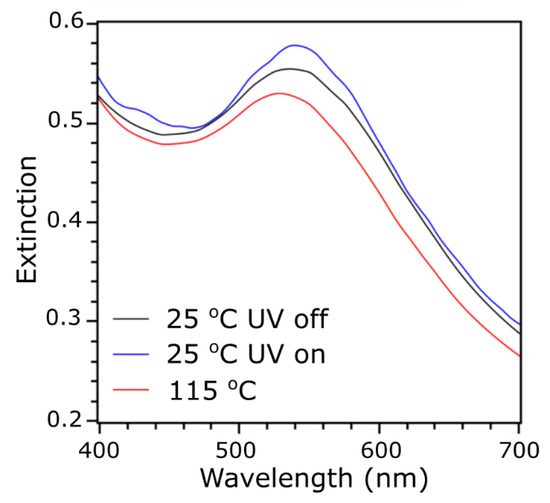 Finally, we aimed at probing the plasmonic properties of nanomaterials under UV light irradiation. The 2-LA and 3-LMLA samples do not exhibit significant localized surface plasmon resonance (LSPR), so only the 5-LMLA material was studied, as shown in Figure 6. The material was drop-casted onto a glass slide, which was mounted onto a Peltier-type heating stage and heat annealed similarly to the XRD samples. A UV–VIS detector was positioned orthogonally to the incoming UV light beam. Measurements of the sample exhibiting the tetragonal phase show a plasmonic band with an absorption maximum at ~540 nm. Redshift of the band, compared to the ~520 nm maximum for the dispersions of these NPs, indicates the coupling of the plasmons in 5-LMLA nanoparticle solid. After heating the sample to 125 °C, an 8 nm blueshift of the plasmonic band maxima was observed. The result is consistent with the growth of nearest neighbor distance between NPs with changing parameters of the tetragonal phase unit cell (i.e., increase of the a parameter) [36,39,51]. As expected from XRD results, there was almost no shift observed for nanoparticles at 25 °C after UV irradiation, as no clear structural changes occur under these conditions. Based on our previous work, we know that if a sample of liquid-crystal-like ligand coated nanoparticles exhibits reversible switching of the structure, the reversible switching of the plasmonic band maxima is also observed [39,43,51].