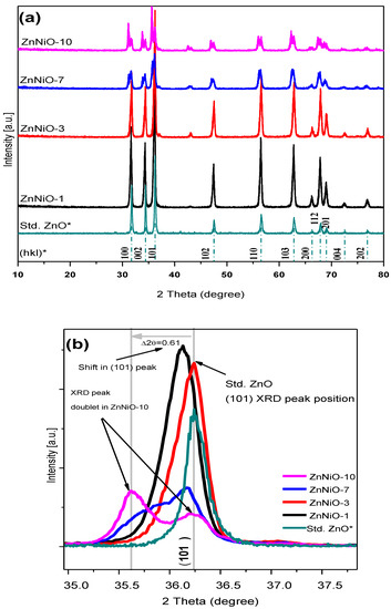 XRD patterns of ZnNiO powders are shown in Figure 1a. For the sake of clarity, a vertical offset of XRD patterns with Ni doping is shown in the figure. All samples exhibit characteristic ZnO peaks at (100), (200) and (101) XRD reflections confirming the wurtzite structure of ZnNiO. Additionally, the sharper and more intense nature of XRD peaks at lower Ni concentrations indicates a strong wurtzite character of ZnNiO nanoparticles. However, on further doping, the XRD peaks become broader and less intense, indicating decay in the wurtzite character. Nonetheless, the wurtzite structure remains a dominant phase, during compositional variation of ZnNiO nanoparticles, indicating a substitutional solid solution formation. Furthermore, absence of any new XRD peaks on Ni doping implies absence of secondary structural phases. Nevertheless, upon careful examination of the XRD patterns, the XRD peaks are found to be dividing into a doublet peak structure; a smaller XRD peak originates nearby each major XRD peak, reflecting a systematic development of structural changes in ZnNiO at higher Ni doping. The observation is further clarified from the XRD peak profiles of 101-reflections plotted in Figure 1b, which clearly show shifted and less intense peaks, reflecting a decay in the wurtzite nature of ZnNiO. The (101)-peak becomes a clear doublet peak at 10% Ni content, Δ2θ ≈ 0.61 for ZnNiO-10, apparently indicating reduction in wurtzite symmetry or a weaker lattice strain induced zinc-blende symmetry at higher doping. The nano phase ZnNiO has already been reported to grow in both wurtzite and zinc-blende metastable phases owing to similarity in their anionic coordination [17]. During the doublet development on doping, as shown in Figure 1b, the lower peak at 2θ ≈ 35.5° can best be attributed to a weaker zinc-Blend symmetry of ZnNiO nanoparticles. Herewith, we reject the possibility of any secondary oxide phase formation on doping in the light of absence of NiO’s XRD peaks. It should be noted that NiO crystals typically adopt hexoctahedral cubic system (XRD card number: RRUFFID-R080121 [42]) and a major XRD reflection of NiO (111) is positioned at 2θ ≈ 37.45. The XRD peaks related to NiO cubic phase are completely absent in the ZnNiO XRD patterns at all doping levels implying absence of new phases. Moreover, the XRD peak shift value of Δ2θ in the present studies can be best ascribed either to uniform crystalline strains present in ZnNiO lattice as a result of ionic radii mismatch between Zn2+ (0.74 Å) and Ni2+ ions (0.69 Å) or to reduced symmetry defects in the crystal structure [20]. The results of the observed crystalline strain behavior in ZnNiO nanocrystals are also summarized in Table 1. Typically, the strain increases in ZnNiO nanoparticles with increasing Ni, and its behavior agrees very well with the increase in unit cell volume.