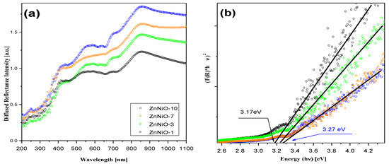 Optical absorption properties and electronic bandgap are determined using a straight-line fit on Kubelka-Munk function calculated from the diffused reflectance data. The DRS data, as shown in Figure 4a, is plotted in the UV-Vis range for ZnNiO nanoparticles with vertically decreasing Ni concentration. The DR values recorded at different compositions of ZnNiO show a rapid decrease at wavelengths lower than 400 nm. The observed reflectance feature is the most common feature among ZnNiO nanoparticles in UV light range due to fundamental absorption onset involving opto-electronic transition from valance band (VB) to conduction band (CB) [1,44]. In general, the optical reflectivity gradually decreases with Ni doping owing to an upsurge in the dopant related internal light scattering events [19]. Indeed, the Ni doping-induced increase in bond-polarizability in ZnNiO can also lead to higher internal light scattering and low DRS intensity [45,46].
