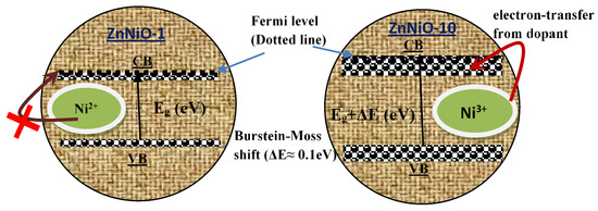 A possible mechanism of the Burstein-Moss-mediated optical absorption process is depicted in Figure 5 (right), illustrating itinerant related optical absorption and electron transfer from the trivalent dopant (Ni3+) to the conduction band (CB) resulting in upshifting of the Fermi-level. Our XPS studies, which are discussed later in the manuscript, also indicate presence of trivalent Ni doping. Thus, the trivalent substitution of Ni atom in the inherently divalent cationic sub-lattice of Zn2+ ions could give electron donating character to nickel atom resulting in the higher carrier concentration effectively lifting the Fermi energy position in the band structure. While the electron transfer is proscribed in the divalent Ni substitution, as shown in Figure 5 (left).