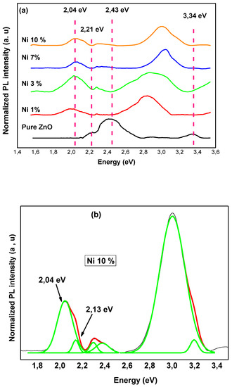 To study the intrinsic and extrinsic defects, photoluminescence (PL) spectroscopy was carried out. Figure 6 shows room temperature PL spectra of ZnNiO nanoparticles excited at 325 nm. It can be seen from the pure ZnO (reference sample) that the PL spectra are mainly comprised of UV emission peaks at 3.34 eV (370 nm) followed by a high-intensity broad visible band with multiple sub-peaks in the range of 2.1–2.75 eV (450–590 nm). The UV emission is attributed to the recombination of free excitons in the near band edge (NBE) of ZnO, whereas the visible band is generally interpreted as the reason for the defects [8,50,51,52,53]. Meanwhile, the origins of different visible emissions are still not fully assumed and different controversial hypotheses have been offered [8,50,51,52,53]. In our case, the emission features at 2.43 eV (510 nm) and 2.21 eV (560 nm) are related to antisite oxide (OZn) and to transmission from conduction band to vacancy, respectively.