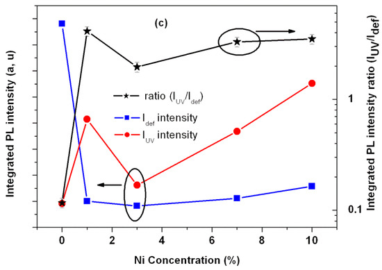 It is shown in Figure 6a that with Ni incorporation, the UV emission intensity typically increases and is shifted to the higher energy, while the intensities of the visible peaks decreases. The results show that Ni doping increases the electron concentration, and that there is a concomitant decrease in the OZn and vacancy defects. On the other hand, additional broad band emissions start becoming apparent at low energy (1.8–2.2 eV) in ZnNiO samples. The broad band is deconvoluted for two different peaks, as shown in Figure 6b. The emission peak at 2.04 eV (607 nm) corresponds to Ni-related defects, and the peaks at 2.13 eV (582 nm) correspond to donor–acceptor pair recombination [52]. For more details, Figure 6c shows changes in the integrated PL intensity of the UV band (IUV), the wide defect-related band (Idef) and the relative PL peak intensities ratio R (IUV/Idef). From our PL observation, it is evident that Ni doping results in enhancement of luminescence arising in the UV band. Meanwhile, the wide defect-related band decreases in comparison to that of the pure ZnO luminescence, as observed in the same plot. Furthermore, the intensity ratio R increases with increasing Ni content and gets saturated at 7% and 10% Ni concentration, showing higher enhancement of UV emission. It is interesting to note that the UV emission is also blue-shifted when the Ni concentration increases from 1% to 10% due to the Burstein-Moss effect [8]. The electron-doped ZnNiO with a high concentration of n-type states populated within the conduction band moves the Fermi level to higher energies. The filling of the conduction band by electrons will generally result in a blue shift [8].