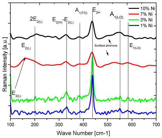 Raman analysis is very useful for finding Ni2+ doping-related changes in ZnNiO crystalline structure, such as the formation of structural disorders, presence of vacancies, or defects in host lattice [32,33]. The host ZnO has a wurtzite structure belonging to P63mc space group symmetry [54]. Eight active normal vibrational modes are present in the wurtzite ZnO comprising of two acoustic modes and six optical modes, of which four optical modes are Raman active [55]. Before explaining the Raman spectra of ZnNiO, a brief description of expected vibrational modes is required. The major Raman modes of ZnO, in Group theory’s Mulliken notations, are A1, 2E2 and E1. The A1 mode is symmetric to principal rotation axis (c-axis) and shows a mode split in the form of A1(TO) and A1(LO) modes relative to transverse and longitudinal one-dimensional atomic vibration. The split is due to the macroscopic electric field of LO vibration increasing the restoring force and stiffness of the bond, thus increasing the split A1 mode’s energy. Similarly, the two-dimensional E1 mode is perpendicular to the c-axis, with displacements of the O- and Zn sub-lattices also showing polarity-induced stiffness and manifesting in the E1 mode’s LO/TO splitting. However, the E2 mode is asymmetric on the c-axis and the polarity-induced macroscopic field can be easily cancelled out due to asymmetric motion of the sub-lattices. Hence, the LO/TO splits do not take place and the mode remains non-polar. Nevertheless, the E2 mode further shows two components, low (E2L) and high (E2H) energy modes due to atomic mass difference between the Zn and O atoms. Additionally, some higher-order difference modes and surface phonon modes are also expected in wurtzite ZnO. The usual Raman modes are often reported in the literature for the wurtzite phase of ZnO: E2L-E2H, A1(TO), E2H, surface phonons and A1(LO) [33,34]. Raman spectra recorded for ZnNiO samples are shown in Figure 7 and all the usual Raman peaks are appropriately marked. The positions of the marked Raman peaks in ZnNiO are generally in agreement with the available literature [30,33,34]. The presence of all the expected Raman modes in the figure indicates conservation of wurtzite phase in ZnNiO.