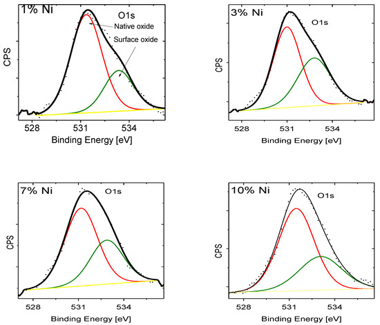 XPS recorded for the ZnNiO samples containing 1%, 3%, 7% and 10% Ni weight percentages. High-resolution XPS spectra are plotted for the O1s photoelectrons.