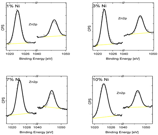 A deconvolution of the XPS peak of O1s electrons in ZnNiO nanoparticles shows two peaks; the first peak is indicative of the native oxygen, and the second deconvoluted peak positioned at 532.5 eV is related to the oxygen defects [58]. Indeed, the oxygen defects are found to increase at higher Ni doping, since the second O1s peak, as shown in Figure 9, becomes larger in area with doping, and that is also indicative of the formation of more oxygen defects due to Ni3+ substitution in the Zn2+ cationic sub-lattice. At higher Ni doping, the XPS spectra of the Zn2p binding energy, see Figure 10, show relatively little change in the positions 1023 eV and 1046 eV of both types of 2p electrons of Zn ion. The Zn2+ oxidation state remains invariant to the doping.