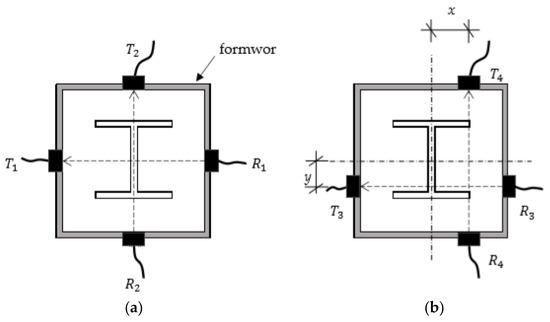 In the field, a concrete member under testing is covered with a formwork, as shown in Figure 1. If there were no steel plates inside, the best location for placing probes was along the centerline, as shown in Figure 1a, because the effect of the edge is minimized along the centerline. However, the centerline might be blocked from measurements depending on the situation around the member in the field. It is also more effective to measure the wave velocity, avoiding the area of the steel plates, as shown in Figure 1b.