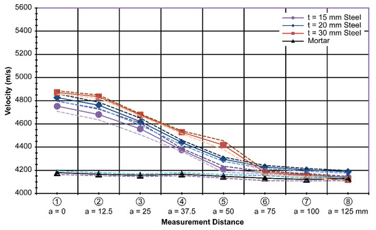 Even though the results with the steel plates showed a clear difference from the mortar results, the distinctions between different thicknesses overlapped somewhat, especially considering the band created by the standard deviation. The measurement results showed that it was quite possible to consider the effect of the steel plate when determining the compressive strength of concrete using ultrasonic testing, as shown in Figure 8.