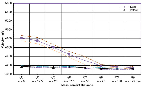 Because the probes were placed farther away from the centerline of the steel plate, it is clear that the effect of the presence of the steel plate on the wave velocity diminished, as shown by the decreasing lines over the a axis in Figure 7. The difference in the measured velocity decreased beyond 75 mm along the a axis. Thus, it is suggested that, practically, ultrasonic probes must be placed exactly along the centerline of the steel plate or within a distance of 75 mm to establish the effect of the steel plate.