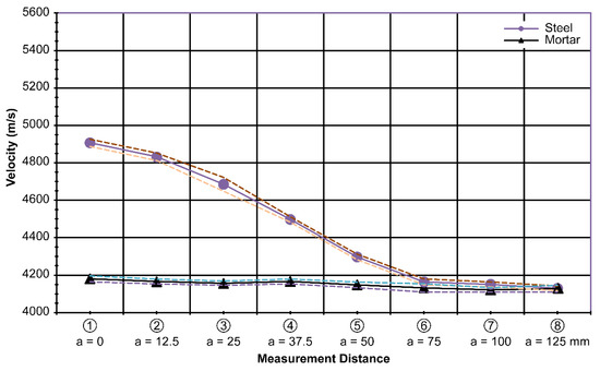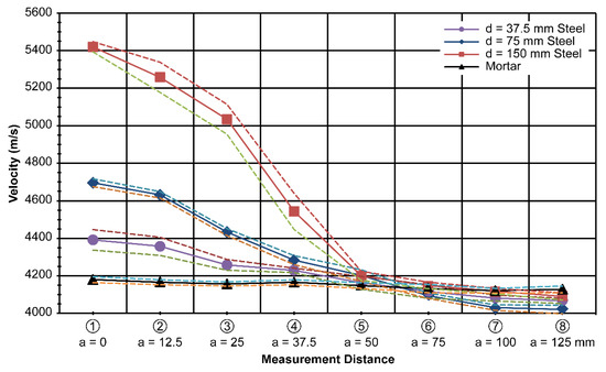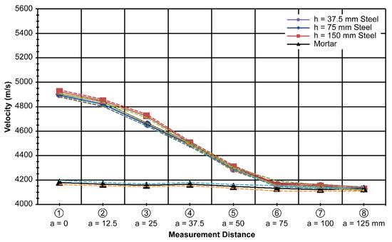 First, the velocity through a mortar specimen was 4150 m/s on average with a standard deviation of 25 m/s, which is 0.6% of the average value. This is regarded as quite stable, and is expected owing to the homogeneity of the mortar. Using this as a reference, the measured velocity with different thicknesses of the steel plates is plotted in Figure 7.