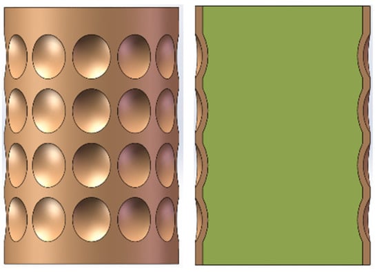 In the study of the molding characteristics of the circumferential MEFP in the literature [13,14,15,16,17], the influence of the change of the relevant parameters of the liner on the forming characteristics of the MEFP is mainly analyzed. Therefore, in this study, the design of the integral circumferential MEFP warhead is shown in Figure 1 when the liner has a certain caliber. The charging height is 52 mm, the diameter of the charging is 37 mm, the liners are arranged along the charging circumference, 4 rows in total along the charging axis, 12 liners in each row along the charging radial direction, giving a total of 48 liners.