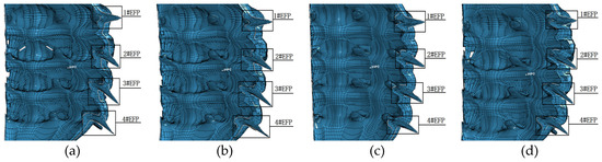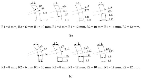 According to the structural parameters shown in Table 6, the integral circumferential MEFP is designed and simulated. When the radius of curvature of the inner wall of the liner is 12 mm and the thickness at the center of the liner is different, with the increase of the curvature radius of the outer wall of the liner, the forming results are shown in Figure 13.