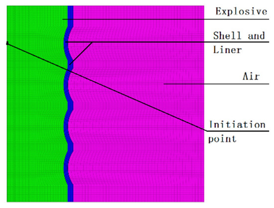 At present, the mainstream grid construction software includes HyperMesh, FEMB, Truegrid, ICEM, etc. [18]. The preprocessing required by LS-DYNA solver can be carried out by various means. Therefore, the preprocessing required by this numerical calculation is carried out by combining ANSYS/ICEM (ANSYS 14.5, Pittsburgh, PA, USA) and HyperMesh (HyperMesh 12.0, Altair, MI, USA). First, the hexahedral grid of the designed integral circumferential MEFP warhead is divided by ANSYS/ICEM, which will be divided. The mesh is imported into HyperMesh in the format of. K file to set the preprocessing of the finite-element model. To reduce the amount of calculation in the numerical simulation, according to the symmetry of the integral circumferential MEFP structure, the quarter finite-element model established is shown in Figure 3. The finite-element model shown in Figure 3 is divided into three parts: the main charge, the shell and the liner, and the air domain. Among them, the charge and the air adopt the Eulerian grid, and the shell and the liner adopt the Lagrangian grid, all of which are hexahedral solid elements with eight nodes. In addition, the multi-material Euler algorithm is used to simulate the forming process of integral circumferential MEFP warhead projectile.