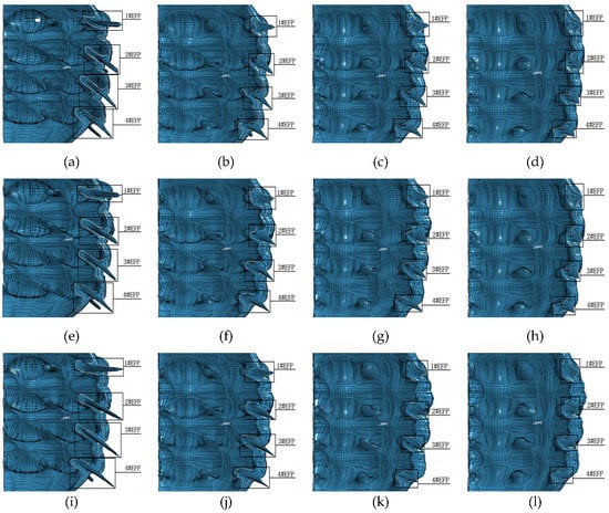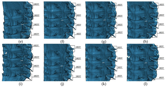 The structure of the integral circumferential MEFP is center symmetric, and the initiation point is in the straight line where the center of symmetry is located. Therefore, in the simulation results, the forming results of the 12 rows of liner are similar, so one of them is selected as the research object, as shown in Figure 4, where 1#EFP-4#EFP in (a–l) represents the forming results of one of the rows of liner. As can be seen from the molding results shown in Figure 4, when the curvature radius of inner wall and outer wall of the shell is constant, the shape of the formed projectile changes with the increase of the thickness at the center of the shell, as shown in Figure 4: a,e,i; b,f,j; c,g,k; As shown in (d), (h) and (l). When the wall thickness of the shaped shell is constant, the length diameter ratio of the formed projectile decreases gradually as the curvature radius of the inner and outer walls of the liner increases, as shown in Figure 4a–d; e–h; i–l. It can be seen from the forming results shown in Figure 4 that when the integrated design of the shell and the liner has variable wall thickness, the projectile forming shape of the integral circumferential MEFP warhead is not only related to the curvature radius of the inner and outer walls of the liner, but also affected by the change of the center thickness of the liner. That is to say, when the liner has variable wall thickness, the shape of the formed projectile is affected by the curvature radius of the inner wall, the curvature radius of the outer wall and the thickness of the center of the liner have a common effect. According to the forming effect of the integral circumferential MEFP warhead shown in Figure 4, when the curvature radius of the inner wall of the liner is between 10 mm and 12 mm, and the corresponding curvature radius of the outer wall of the liner is between 8 mm and 10 mm, the shape of the formed projectile is more reasonable.