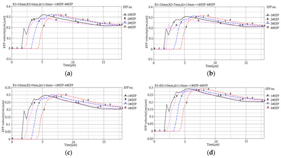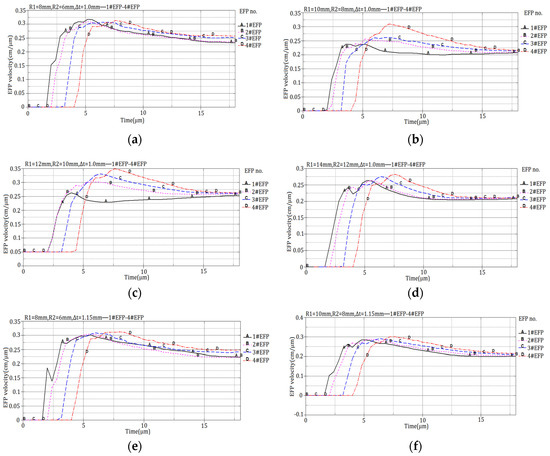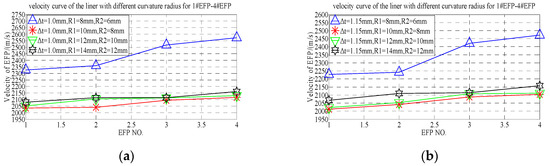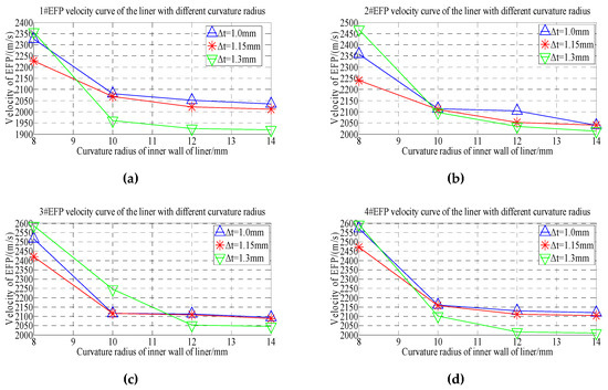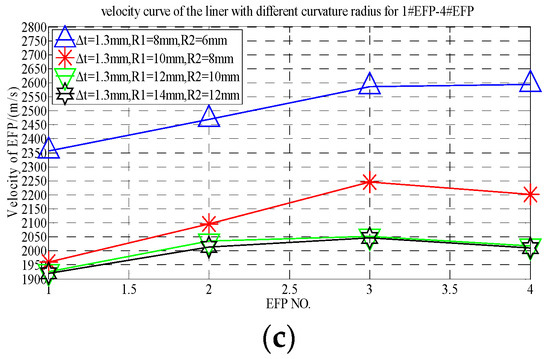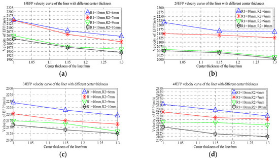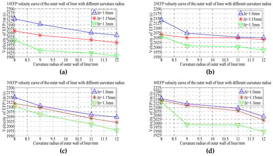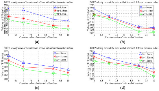 It can be seen from Figure 7 that when the thickness of the center of the liner is 1 mm–1.15 mm, the speed of 1#EFP-4#EFP increases gradually, as shown in Figure 7a,b; when the thickness at the center of the liner is 1.3 mm, the speed of the inner wall of the liner is 8 mm, the speed of 1#EFP-4#EFP increases gradually; when the curvature radius of the inner wall of the liner is 10–14 mm, the velocity of 1#EFP-3#EFP increase gradually, and the speed of 4#EFP starts to decrease, as shown in Figure 7c.