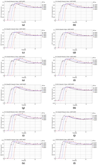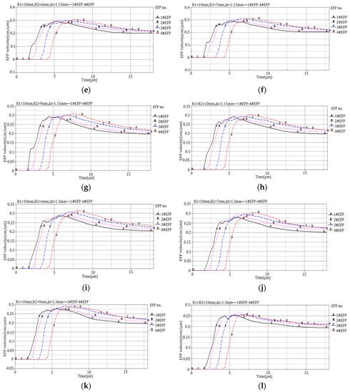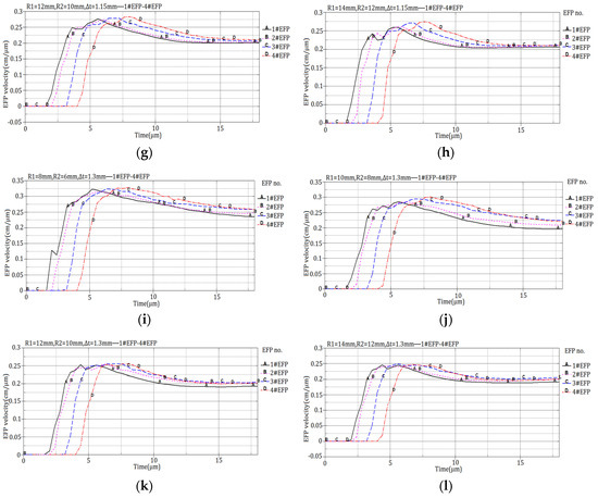 1#EFP-4#EFP formed velocity of the liner which different curvature radius of outer wall and different center thickness:(a) R1 = 10 mm, R2 = 6 mm, t = 1.0 mm; (b) R1 = 10 mm, R2 = 7 mm, t = 1.0 mm; (c) R1 = 10 mm, R2 = 9 mm, t = 1.0 mm; (d) R1 = R2 = 10 mm, t = 1.0 mm; (e) R1 = 10 mm, R2 = 6 mm, t = 1.15 mm; (f) R1 = 10 mm, R2 = 7 mm, t = 1.15 mm; (g) R1 = 10 mm, R2 = 9 mm, t = 1.15 mm; (h) R1 = R2 = 10 mm, t = 1.15 mm; (i) R1 = 10 mm, R2 = 6 mm, t = 1.3 mm; (j) R1 = 10 mm, R2 = 7 mm, t = 1.3 mm; (k) R1 = 10 mm, R2 = 9 mm, t = 1.3 mm; (l) R1 = R2 = 10 mm, t = 1.3 mm.