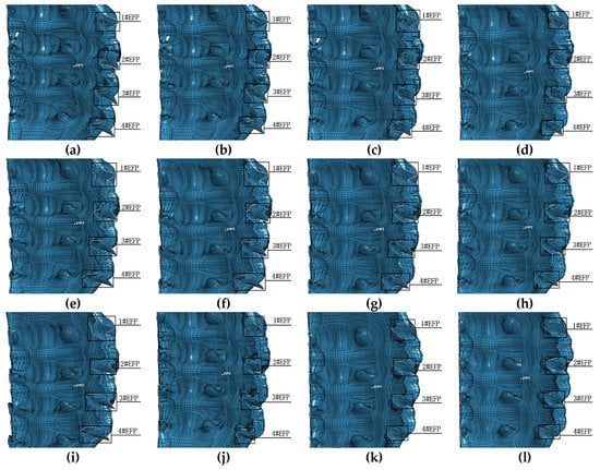 Forming results of integral circumferential MEFP warhead projectile: (a) Scheme 1 forming results; (b) Scheme 2 forming results; (c) Scheme 3 forming results; (d) Scheme 4 forming results; (e) Scheme 5 forming results; (f) Scheme 6 forming results; (g) Scheme 7 forming results; (h) Scheme 8 forming results; (i) Scheme 9 forming results; (j) Scheme 10 forming results; (k) Scheme 11 forming results; (l) Scheme 12 forming results.