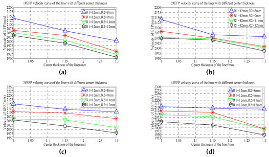 As can be seen from Figure 17, when R2 = 8 mm, with the increase of the thickness at the center of the liner, the speed of 1#EFP decreased from 2137 m/s to 2004 m/s, which decreased by about 6.2%; the speed of 2#EFP decreased from 2141 m/s to 2057 m/s, which decreased by about 3.9%; the speed of 3#EFP decreased from 2150 m/s to 2103 m/s, which decreased by about 2.2%; the speed of 4#EFP decreased from 2155 m/s to 2136 m/s, which decreased by about 0.9%. When R2 = 9 mm, with the increase of the thickness at the center of the liner, the speed of 1#EFP decreased from 2065 m/s to 1941 m/s, which decreased by about 6%; the speed of 2#EFP decreased from 2083 m/s to 2008 m/s, which decreased by about 3.6%; the speed of 3#EFP decreased from 2105 m/s to 2062 m/s, which decreased by about 2.1%; the speed of 4#EFP decreased from 2123 m/s to 1992 m/s, which decreased by about 6.2%. When R2 = 11 mm, with the increase of the thickness at the center of the liner, the speed of 1#EFP decreased from 2051 m/s to 1924 m/s, which decreased by about 6.2%; the speed of 2#EFP decreased from 2053 m/s to 2003 m/s, which decreased by about 2.4%; the speed of 3#EFP decreased from 2060 m/s to 2011 m/s, which decreased by about 2.4%; the speed of 4#EFP decreased from 2095 m/s to 1989 m/s, which decreased by about 5.1%. When R2 = 12 mm, with the increase of the thickness at the center of the liner, the speed of 1#EFP decreased from 2035 m/s to 1907 m/s, which decreased by about 6.3%; the speed of 2#EFP decreased from 2050 m/s to 1986 m/s, which decreased by about 3.1%; the speed of 3#EFP decreased from 2055 m/s to 1979 m/s, which decreased by about 3.7%; the speed of 4#EFP decreased from 2043 m/s to 1947 m/s, which decreased by about 4.7%.