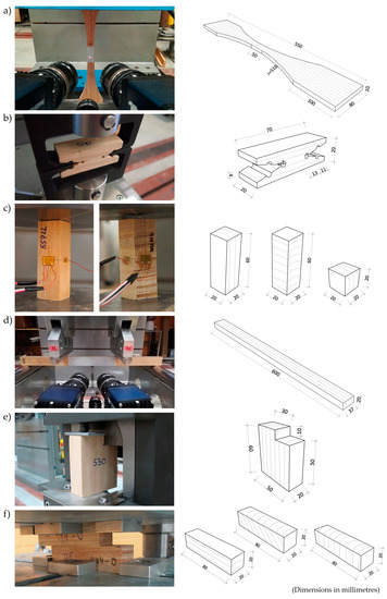 Test setup (left column) and specimen geometry (right column): (a) tension parallel to grain; (b) tension perpendicular to grain; (c) compression parallel and perpendicular to grain; (d) static bending; (e) shear; (f) timber-to-timber static friction.