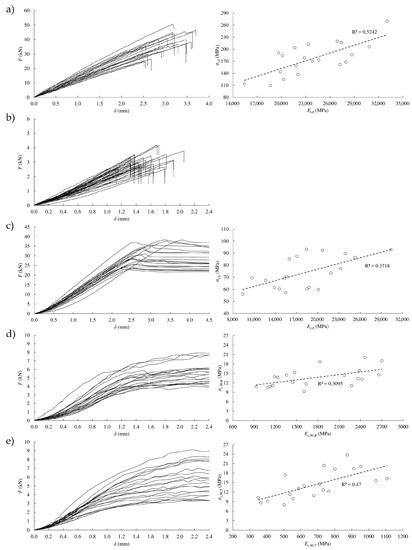 Load-displacement curves (left column) and correlation between ultimate stress and modulus of elasticity (right column): (a) tension parallel to grain; (b) tension perpendicular to grain; (c) compression parallel to grain; (d) compression perpendicular to grain in radial direction; (e) compression perpendicular to grain in tangential direction.