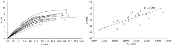 In general, correlations between the respective modulus of elasticity and ultimate stress in compression resulted lower than correlations derived from tension tests (Figure 3d,e, right).