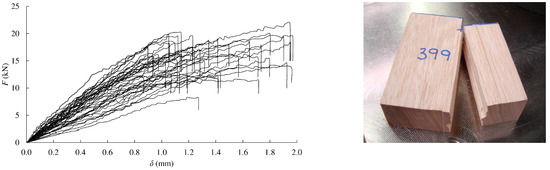 The load-displacement curves obtained from shear tests are represented in Figure 7 (left). The ultimate stress values ranged from 8.5 to 22.5 MPa, with 16.2 MPa being the mean value, around 9% of the ultimate tension stress parallel to grain. This value resulted between 1.5 and 2 times higher than those reported in [31] for the four Spanish pines following the same standard. It was also higher than most of the respective data obtained from shear block tests in a broad number of wood species compiled in [34]. A clear fracture by the shear plane was produced in all the specimens (Figure 7 right).