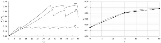 Figure 8 (left) depicts the typical relationship curves between friction load and time obtained from pairs of eucalyptus pieces oriented at 0°, 45°, and 90° with respect to the friction plane. In Figure 8 (right), the mean values of static friction coefficient for the three analyzed angles are plotted. The mean friction coefficient between the eucalyptus pieces with the grain oriented parallel to the friction plane, µs,0, resulted in 0.08. This value increased 2.5 times (µs,45 = 0.20) when the grain formed 45° with that plane. However, the friction coefficient hardly increased for the specimens with the grain oriented at 90° in comparison with 45°, resulting in an average value of µs,90 = 0.24.