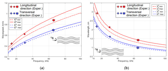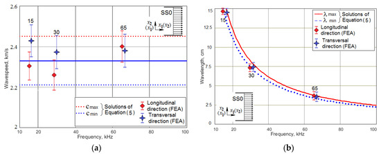 where is a speed of the SH wave propagation, and is a non-negative integer. Both of these equations have the real solution only at the . Hence, the wave speed for these directions of two non-dispersive SH waves are equal to . The dependencies of the SS0 wave speed and wavelength on the frequency are shown in Figure 2a,b, together with the results of the FE simulation at the actuator’s first eigenfrequencies.