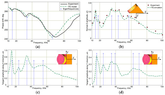 The frequency response functions for the Olympus actuator: (a)—phase angle of PZT current; (b–d)—averaged displacement amplitudes on the contact footprint surface—normal (b) and tangential (c,d).