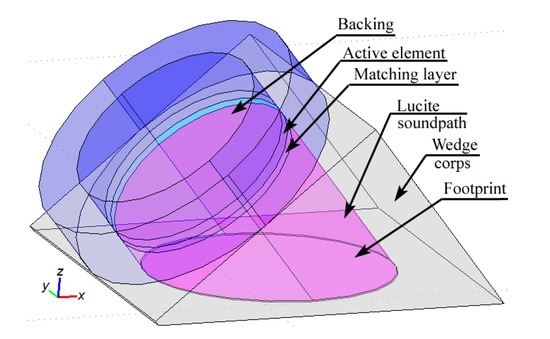 The paper [35] studied the effect of dimensions, the shape and the aperture on the frequency response and the directivity of the waves generated by the angle-beam wedge transducer in an isotropic half-space, using the boundary element method. The authors presented the results of a comprehensive parametric study in an effort to establish the guidelines and the criteria for the optimum wedge transducer design. The main objective of the study was the optimal choice of the wedge shape and dimensions to avoid spurious eigenmodes or unexpected wave propagations within the wedge. In the paper [36], which studies the similar problems, the effect of the shape and size of wedge-shaped substrates on the whole transducer system was discussed, and the design of a transducer was optimized to supply its performance when it generates the acoustic wave in a tested thick-walled structure made of isotropic material by using a 2D finite-element (FE) model.