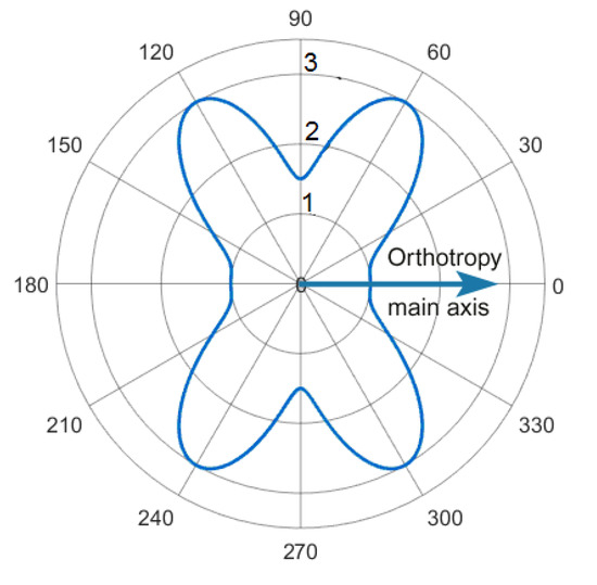 where the matrix coefficients, , are expressed through the elements of the orthotropic material’s stiffness matrix, , the material density, , the wave numbers, , the plate thickness , on the angle, , orientation of the wave path relative to the main orthotropy axis, , and on the angular velocity, [47]. To find the eigenvalues of Equation (2), the zero-determinant condition was imposed: