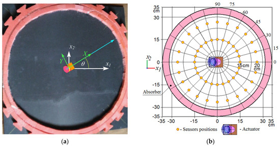Despite the very intensive acoustic wave attenuation, whose angular distribution was measured by the authors and presented in [20] (see Figure 6), the square CFRP panel was equipped with the porous rubbery absorber to fully eliminate the wave reflections from the edge of the plate (see Figure 7a). The FE model of the studied system provided this attenuation inside the circle of radius 27.5 cm by the Rayleigh damping coefficients, which were determined experimentally in [20], depend on the orientation in a polar coordinate system. However, outside this circle, the damping coefficients increased quadratically, while maintaining C0 and C1 continuities (of the damping coefficients distribution and their spatial derivatives, respectively) at the boundary of the circle. By such a way, the perfectly matched layer was designed to eliminate the wave reflection. On average, for different frequencies, the model consisted of 250–300 thousand of the finite elements; the number of degrees of freedom of the problem was 1.2 × 106–1.5 × 106. The calculation time of one variant with 7–8 fluctuations in the control voltage varied from 4 to 8 h on a computer with an i7 processor and 32 GB of RAM.