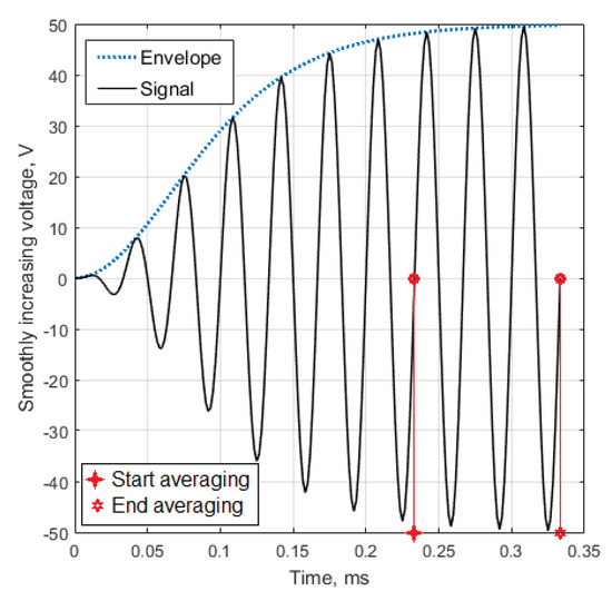 In each test, for the variable frequencies and angles of the actuator orientation, the amplitude of the control signal gradually increased, reaching 50 V, and then stabilized (see Figure 8). These actuator driving signals were prepared by using the AWG/AFG software for Windows (V3.4, Tektronix, Inc., Beaverton, OR, USA). They were transmitted to a Tektronix arbitrary function generator and amplified by PA94 piezodrivers (Apex Co., Tucson, AZ, USA). The actuator’s and sensors’ (STEMiNC SMD10T2R111WL, Davenport, FL, USA) signals were registered by oscilloscope LeCroy (Teledyne LeCroy GmBH, Heidelberg, Germany) and stored for each testing condition in the files, which were then numerically processed.