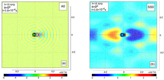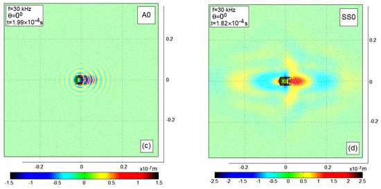 Comparison of Figure 1b and Figure 2b demonstrates that the wavelength of A0 Lamb waves mode is 2–5 time less than the wavelength of SS0 horizontally polarized shear wave, i.e., spatial defects resolution of A0 waves can be significantly better that is fully consistent with the results of the papers [11,20,22,30].