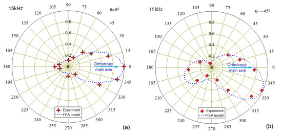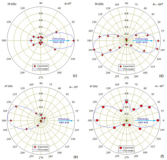 The directivity diagrams for the Lamb waves excited by the actuator, whose angular orientation relatively to the main orthotropy axis of the CFRP panel was changed discretely in interval with a step 15°, were implemented using two identical sensors 15 cm and 20 cm away from the center of the actuator’s footprint (see Figure 7b). For each actuator’s position, these sensors were registering the signals depending on the out-of-plane displacement at their locations. In order to reduce the experimental noise, the registration of radiation directivity was carried out with an angular step of 15 degrees for two closely spaced distances. Due to the attenuation, the signals recorded at distances of 15 cm and 20 cm were unequal. Therefore, the values of both radiation patterns were normalized and averaged. Their values are presented in Figure 10a–f.