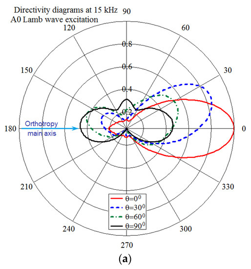 The next study included the wave directivity simulation at the different angles, θ, between the actuator’s axis and the main axis of anisotropy of the CFRP panel. A0 Lamb waves directivity was studied both numerically and experimentally, whereas SS0 waves directivity was studied only numerically. Our results demonstrated a very complex dependence of the directivity diagrams on this angle, θ; and this dependence is determined by the generated wave’s frequency, by the normal oscillation mode of the actuator and by the anisotropic damping of the CFRP panel. The presented results revealed a better ability to change the waves directivity generated by the angle-beam wedge actuator, compared with the omnidirectional ones, but also the limits of these waves orientation controllability that is due to the high anisotropy of the elastic and damping properties of such composite structures.
