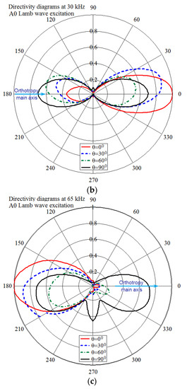 Variation of the A0 Lamb waves directivity with the wedge actuator’s angular orientation relative to the main axis of orthotropic symmetry of the CFRP plate at the excitation frequencies 15 kHz (a), 30 kHz (b), and 65 kHz (c).