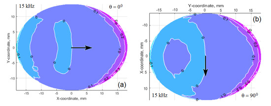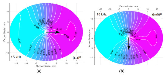 Despite the similarity of these tangent radial stress patterns for each excitation frequency (especially at the frequency 65 kHz), the dynamic response of the excited structure depends on the structural and the damping anisotropy of the material, and also on the panel thickness, which determines the structural stiffness near the actuator location [21]. Two patterns of the amplitude radial tangent displacement at the same frequency, but at the different actuator orientations along (a) and across (b) the main axis of the orthotropic panel (see Figure 13) illustrate this statement. As can be seen, the displacements in the direction of greater structural compliance are significantly higher.